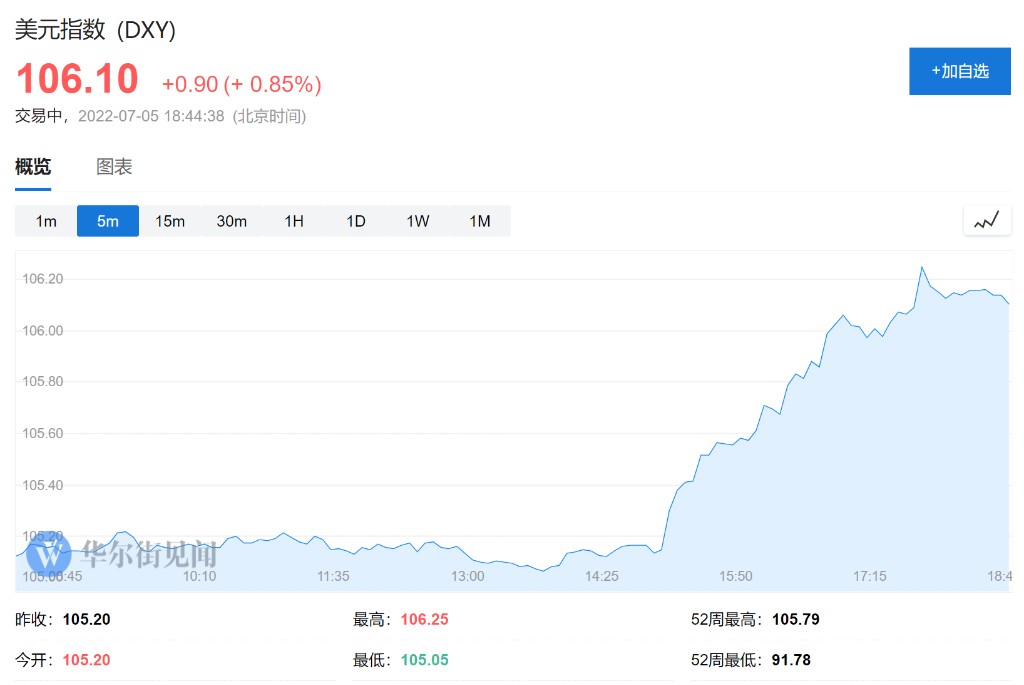 欧元兑美元汇率跌至 20 年来的最低点。美元指数走高,日内涨超 0.85%,现报 106.10,续创 2002 年 12 月以来新高。