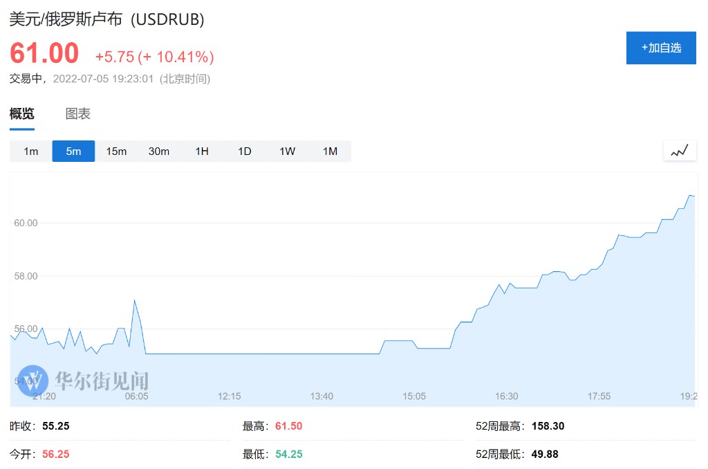 截至发稿,美元兑俄罗斯卢布持续走高,升破 61,日内涨超 10%。