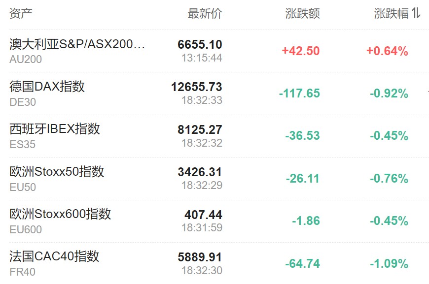 截至发稿,欧洲市场方面普遍走低,欧洲斯托克 600 指数一度跌 0.45%,欧洲斯托克 50 指数跌 0.76%,德国 DAX 指数跌 0.92%,法国 CAC 指数跌 1.09%