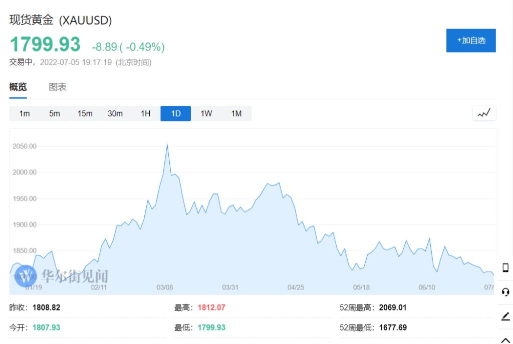 现货黄金跌破 1800 美元/盎司,日内跌约 0.5%。