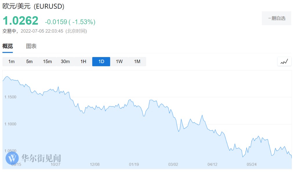 由于投资者担心能源危机导致欧洲经济陷入衰退,欧元兑美元持续下挫,创下了 2002 年 12 月以来的最低点。截至发稿,欧元兑美元汇率以跌超 1.5% 至 1.026 美元。
