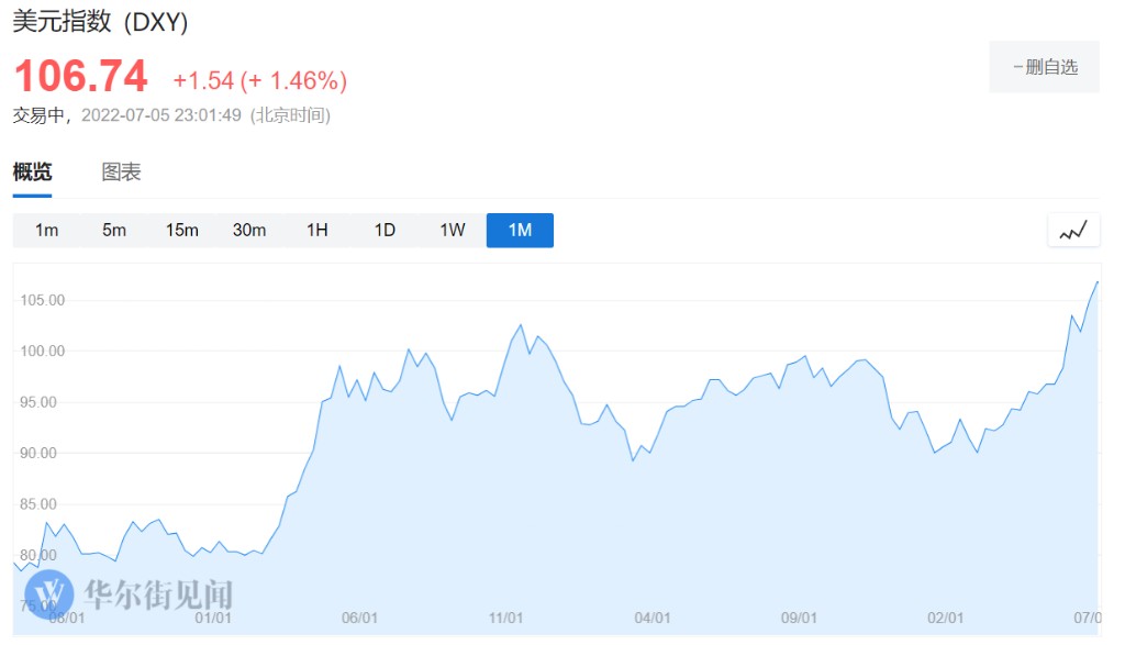 美元指数走高,日内涨超 1%,现报 106.74,创 2002 年 12 月以来新高。