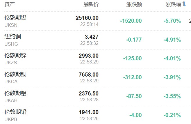其他大宗商品纷纷走低,伦锡跌超 5%,伦锌大跌 4%;被视为世界经济晴雨表的伦敦铜价日内跌近 4%,创下了 2020 年 12 月以来的盘中最低点,并逐渐逼近 7600 美元的关口。