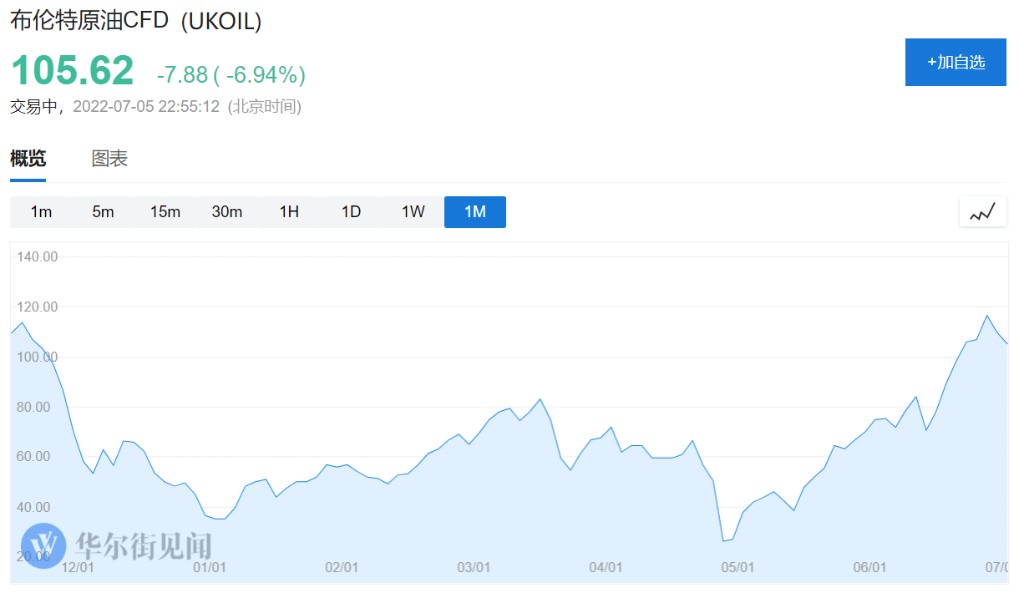 国际油价持续下挫,布伦特原油现跌近 7%,报 105.6 美元/桶。