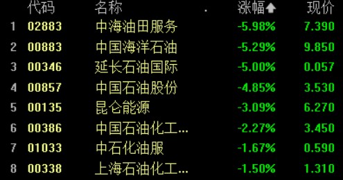 石油股跌幅持续扩大,中海油田服务跌超 6%,中国石油股份、中国海洋石油、延长石油国际跌超 5%,昆仑能源跌超 3%。