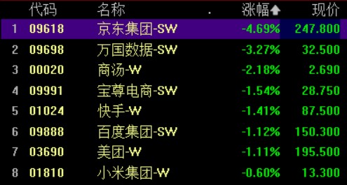 科技股走低,京东跌幅一度扩大至 5%,盘中最低触及 247 港元;昨日大涨的商汤今日回调 2%,腾讯、快手、百度、美团跌超 1%,阿里巴巴逆势涨超 1%。