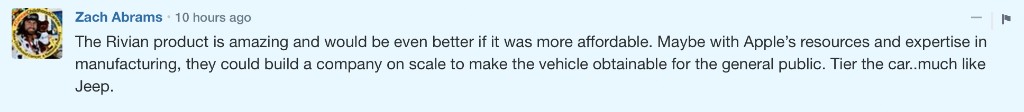 有网友指出,Rivian 的产品很惊艳,如果价格再实惠些就更好了。也许凭借苹果在制造业的资源和专业性,他们可以建立一家规模较大公司,让大众也能够获得这款汽车。