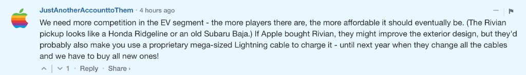 也有网友认为,电动汽车领域需要有更多参与者,竞争越充分,价格就越合理。(Rivian 皮卡看起来像本田 Ridgeline 和旧款斯巴鲁 Baja)。如果苹果收购了 Rivian,他们可能会改进外观设计,也可能会让你使用专有的超大尺寸车载充电设备。