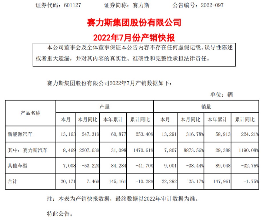 小康股份 7 月新能源汽车销量 13291 辆,同比增长 316.78%;其中赛力斯汽车销量 7807 辆,同比增长 8873.56%。2022 年 1-7 月,小康股份交付新车 58913 台,同比增长 224%。