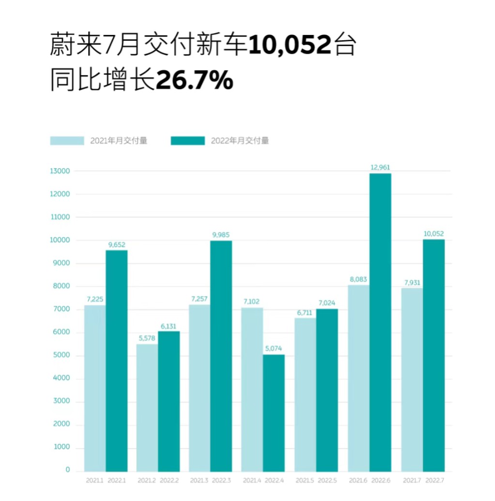 根据蔚来公布的最新数据,2022 年 7 月,蔚来交付新车 10052 台,同比增长 26.7%;2022 年 1-7 月,蔚来交付新车 60879 台,同比增长 22%。自交付以来,蔚来车辆累计已交付 227949 台。