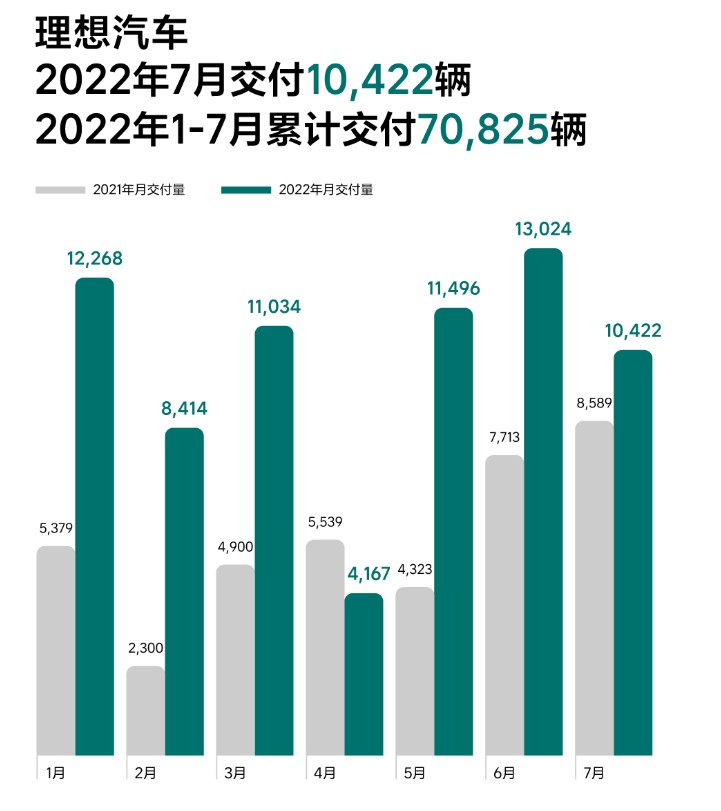 根据官网公布的数据,2022 年 7 月,理想汽车交付 10422 辆理想 ONE,同比增长 21.3%。今年 1-7 月理想汽车累计交付 70825 台,同比增长 82.8%。自交付以来,理想 ONE 累计交付量已达 194913 辆。