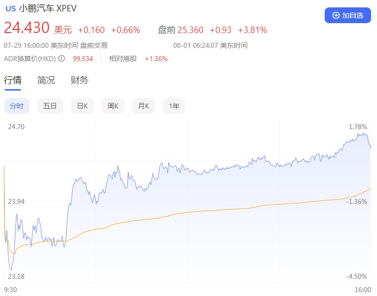 交付数据公布后,小鹏汽车美股盘前一度涨超 4%。
