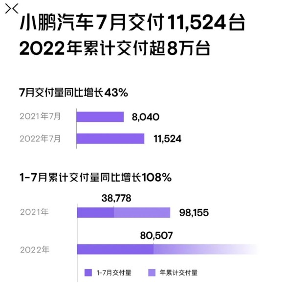 小鹏汽车公布的最新数据显示,2022 年 7 月,小鹏汽车总交付 11524 台,同比增长 43%;但相较 6 月少卖了 3771 台,环比下降近 25%;今年 1-7 月小鹏汽车累计交付超过 8 万台,为去年同期的 2.1 倍,继续稳坐销冠之位;自交付以来,小鹏汽车历史累计交付量已接近 22 万台。
