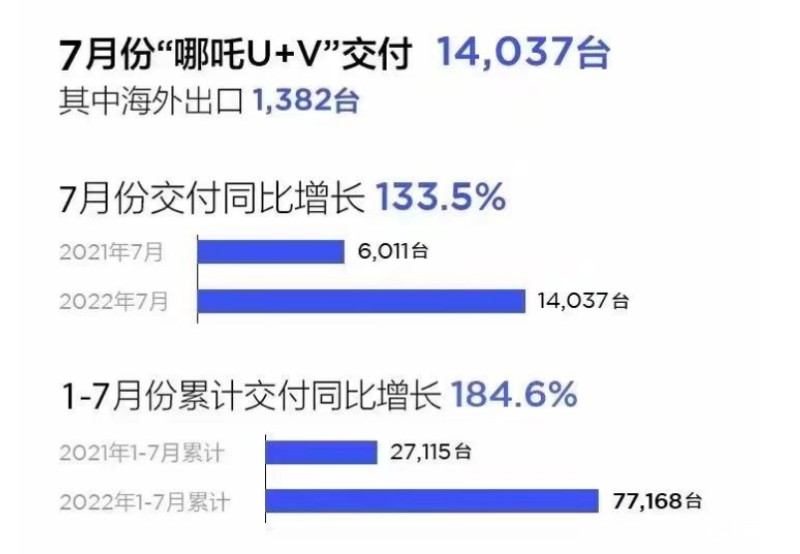 哪吒汽车率先公布其 7 月的交付量。数据显示,7 月哪吒汽车实现交付量 14037 辆,同比增长 133.5%;其中海外出口量为 1382 辆。今年前 7 个月哪吒汽车累计交付量为 77168 辆,同比增长 184.6%。