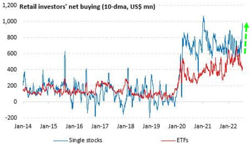 市场现在关注的是,散户是不是在 “逢低买入” 之后,仍然无力抵抗美国衰退的经济,从而这些股票变成他们的烫手山芋?