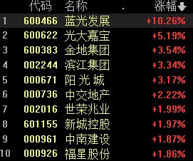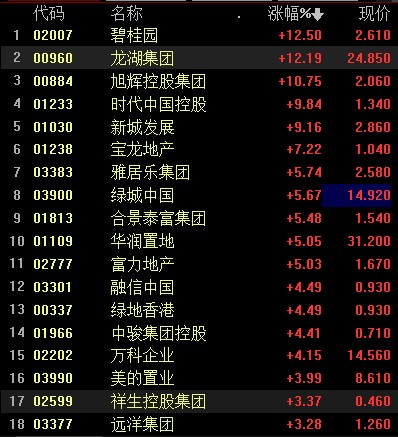 A 股市场上,阳光城、中迪投资双双封板,蓝光发展涨停,中交地产此前涨超 8%,金地集团一度涨逾 7%。