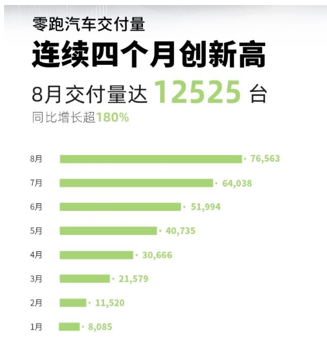 8 月,零跑汽车共交付 12525 台新车,连续四个月创新高。2022 年 1-8 月,零跑已累计交付 76563 台。