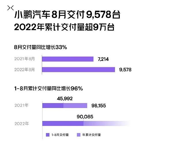 今年 8 月,小鹏共计交付 9,578 台,其中,小鹏 P7 交付 5,745 台,小鹏 P5 交付 2,678 台,小鹏 G3 系列交付 1,155 台。2022 年 1-8 月,小鹏汽车累计交付已经超过了 9 万台。