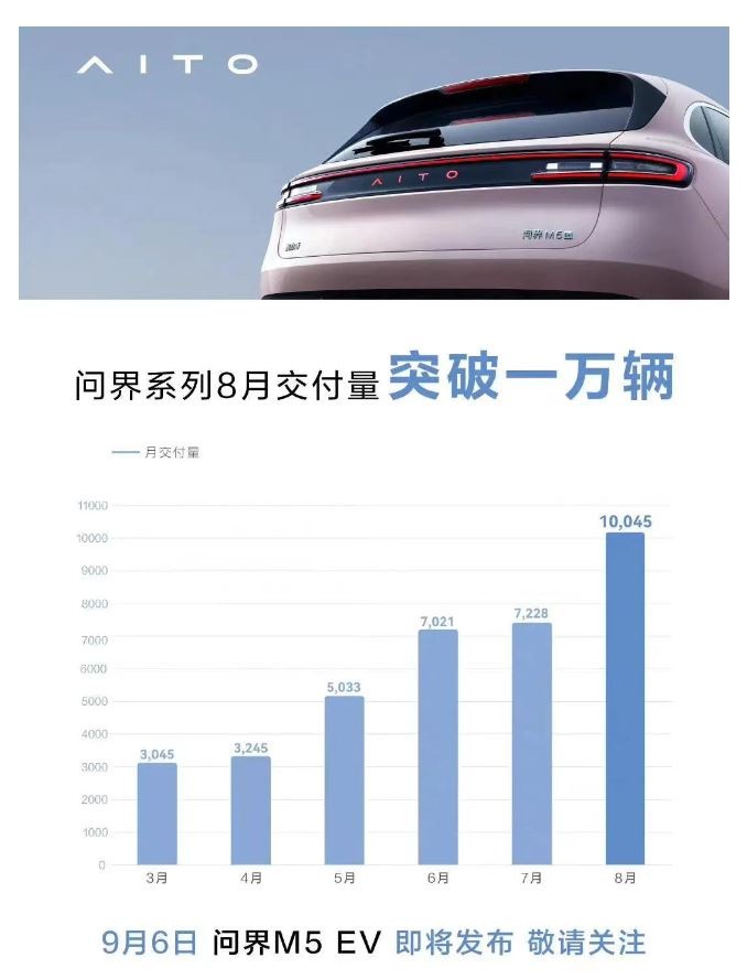 8 月份,问界系列(M5+M7)的交付量去到了 10045 辆,相比 7 月的 7228 辆有了不小的增长,达成了 AITO 品牌首次月销破万的成就。