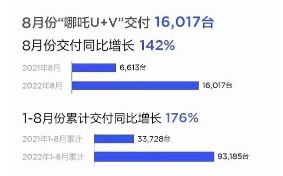 8 月,哪吒汽车交付 16017 台,也是创下月度新高。其中,哪吒 U 车系交付 5781 台;哪吒 V 车系交付 10236 台。