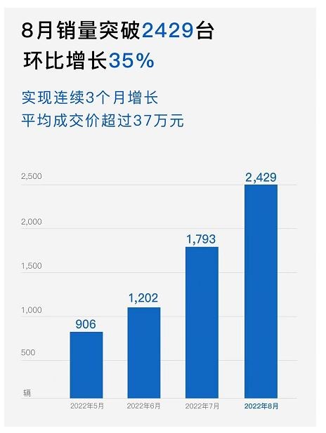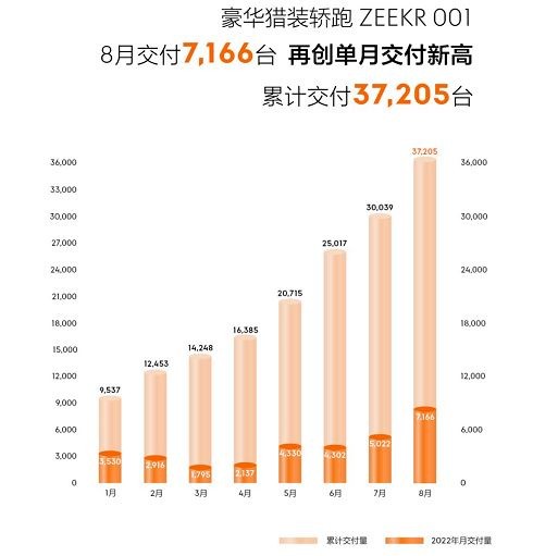 8 月,极氪 001 共计交付 7166 台,创下月交付的新高,实现了累计交付 37205 台。与此同时,8 月极氪 001 的大定订单(5000 元不可退定金)量也实现了破万,可以说是做到了「双增长」。