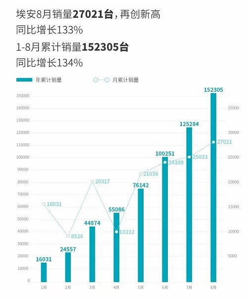 8 月份,埃安销量 27,021 台,1-8 月累计销量 152,305 台......