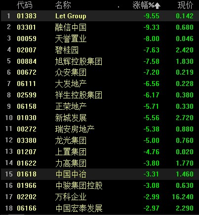 融信中国跌超 9%,碧桂园、旭辉控股集团跌近 8%,正荣地产、新城发展、瑞安房地产跌超 5%,龙光集团跌 5%,力高集团跌近 4%。