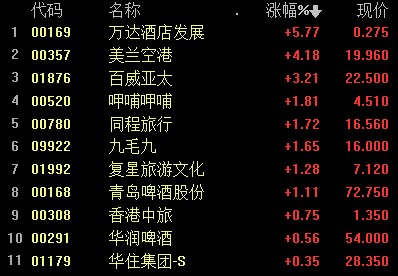 万达酒店发展涨近 6%,美兰空港、新濠国际发展涨超 4%,金沙中国有限公司涨近 4%,百威亚太涨超 3%,呷哺呷哺、同城旅行、九毛九涨近 2%,复星旅游文化、青岛啤酒股份涨超 1%。
