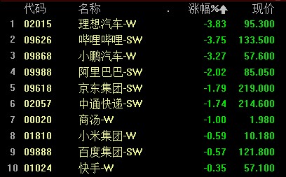 恒生科技指数跌超 2% 新能源汽车股普跌 蔚来跌超 6%