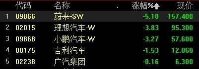 新能源汽车股多数低开,蔚来跌超 6%,理想汽车跌近 4%,小鹏汽车跌超 3%,吉利汽车跌 1.5%。