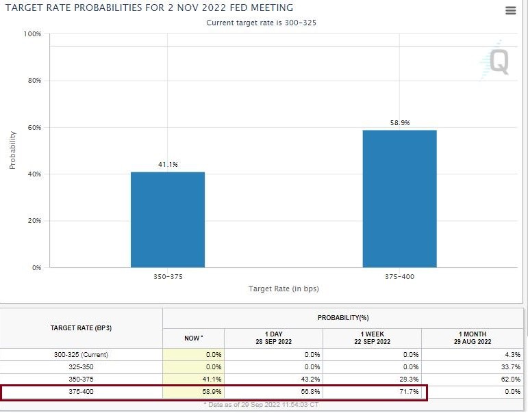 到本周四美股盘中,芝商所(CME)的 “美联储观察工具” 显示,美国联邦基金利率期货交易市场预计,11 月美联储加息 75 个基点的几率接近 59%,加息 50 个基点的几率约为 41%,一周前预计加息 75 基点的几率超过 70%、预计加息 50 基点的几率约为 28%。