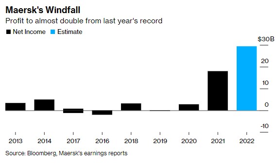 因此,该公司的收益可能会像坐过山车一样。彭博社的最新调查显示,马士基今年的净利润将比 2021 年已经很高的水平几乎翻一番,达到创纪录的 293 亿美元。这将使它成为斯托克欧洲 600 指数中利润第三高的股票。