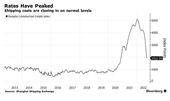 智通财经 APP 注意到,马士基的利润飙升是因为运力短缺,加上供应链瓶颈和新冠疫情封锁,导致运费飙升。根据上海航运交易所集装箱指数 (衡量中国出港运费的指标),从 2019 年 10 月到 2022 年 1 月的峰值,运费上涨了 7 倍多,之后随着港口开放和拥堵缓解,运费价格下降了约 60%。