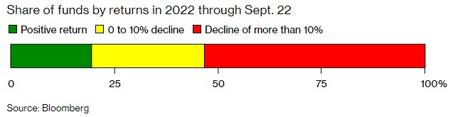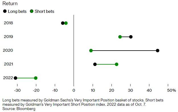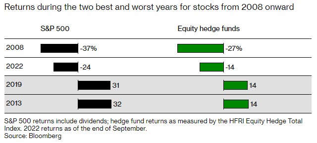 基金经理们也没能很好地将最好的公司和最差的公司区分开来。高盛编制的最受对冲基金欢迎押注的两个指数显示,在市场大幅下跌期间,对冲基金的做多选择表现不如做空选择。在市场上涨的时期,他们做空的股票也会上涨。而今年,对冲基金最青睐的股票下跌了约 31%,但他们做空的股票只下跌了 20%。换句话说,作为一个整体,对冲基金在他们认为会上涨的股票上的损失要大于在他们认为会下跌的股票上获得的回报。