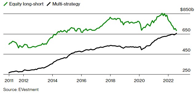 虽然股票多空对冲基金仍主导着这个规模达 4 万亿美元的行业,资产规模约为 6830 亿美元,但它们已接近被所谓的多策略对冲基金超越。多策略对冲基金投资于多个资产类别,通常由不太知名、但可替换性更强的经理团队管理。据 EVestment 的数据,这两种策略的资产管理规模差距从一年前的 2350 亿美元缩小至今年 8 月的 270 亿美元左右的历史最低水平。