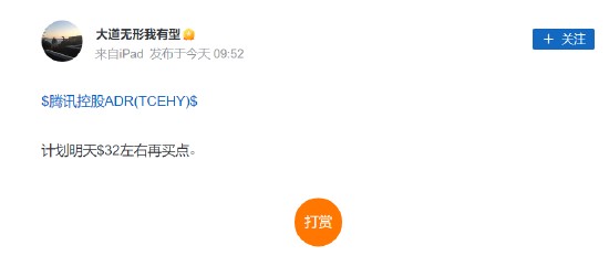 “计划明天 32 美元左右买入腾讯 ADR”,段永平称。如果段永平按计划买入,这将是其今年至少第五次买入腾讯。此前,段永平在 2 月、3 月、4 月、8 月曾四次自称抄底腾讯,并在 8 月 4 日时表示已经开始浮亏,彼时腾讯 ADR 的价格在 39 美元多,而 10 月 11 日收盘价仅 32 美元出头。