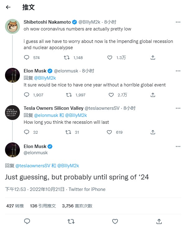 一名 Twitter 用户请教马斯克,经济衰退会持续多久,马斯克留言回复说:“我只是猜测,可能会持续到 2024 年春季。”