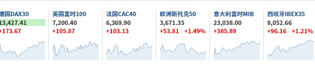 欧股集体高开,德国 DAX30 指数涨 1.31%,英国富时 100 指数涨 1.46%,法国 CAC40 指数涨 1.68%,欧洲斯托克 50 指数涨 1.49%。