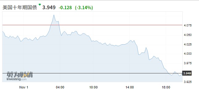 美国国债扩大涨幅,美国 10 年期国债收益率下降 10 个基点至 3.94%。