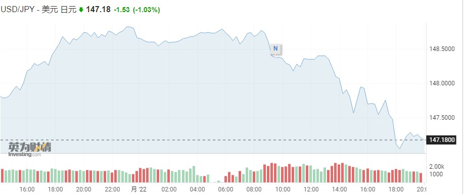 美元兑日元日内走低 1%,一度跌至 147.16。