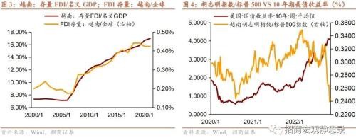 疫前的产业红利在疫后加速,资本过快流入带来了 “过热” 隐患,美联储紧货币影响国际资本流向,越南央行加息戳破本土泡沫。2011 年中国刘易斯拐点出现后,中国大陆开始将部分中低端制造业向越南等东盟国家,自此国际资本加速流入越南。疫后,东盟加速推进了 RCEP,美国也在今年牵头了区域贸易框架,越南在全球产业链上越发 “炙手可热”,FDI 存量占其 GDP 比重在疫后又上了一个台阶。疫后美联储扩表则使得短期热钱跟随产业资金一并大举流入越南。但美联储紧货币影响了全球资本流向,如图 4 可知,今年 3 月越南胡志明指数与标普 500 指数比值开始触顶回落,美联储加息对新兴市场的负面影响可见一斑。Q3 越南央行紧货币则是戳破本土泡沫的一根稻草。