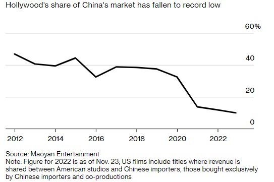 根据票务平台猫眼娱乐的数据,今年迄今,已有 23 部美国电影在中国上映,占总票房的 10%。去年在中国上映的美国电影有 28 部,占票房收入的 12%。