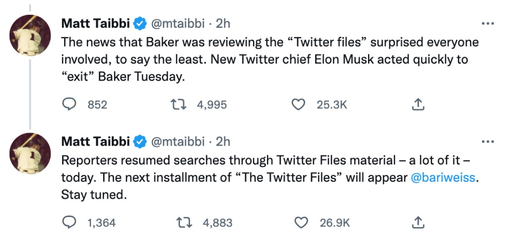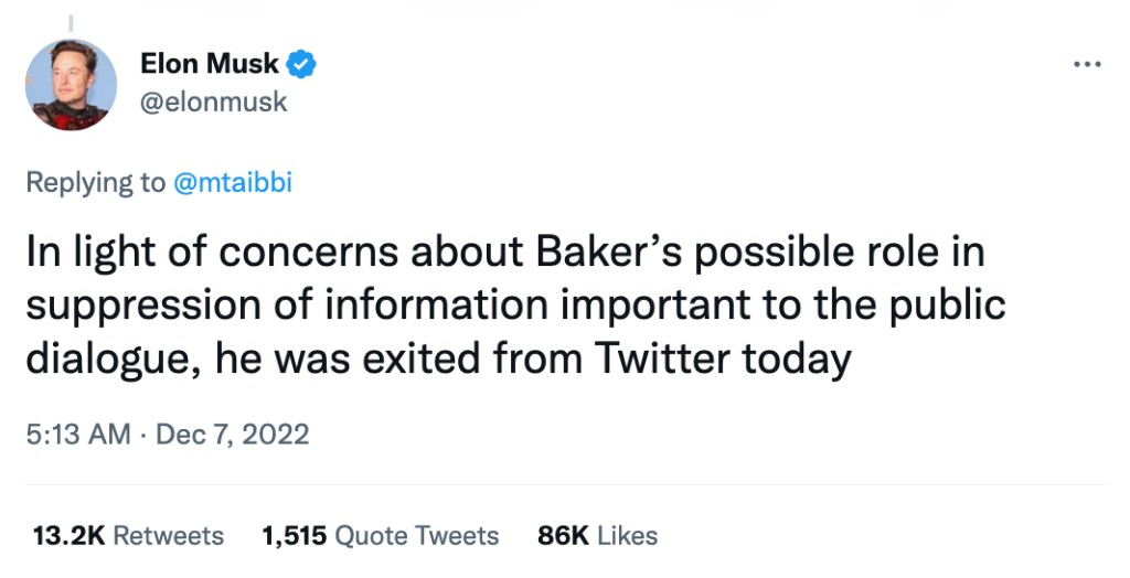 马斯克似乎是指 Baker 参与了阻止 “推特档案”(Twitter Files)的发布。上周,记者 Matt Taibbi 最先爆料了这一事件,其中包括推特内部屏蔽媒体的一篇有关亨特·拜登笔记本电脑泄露事件的报道。