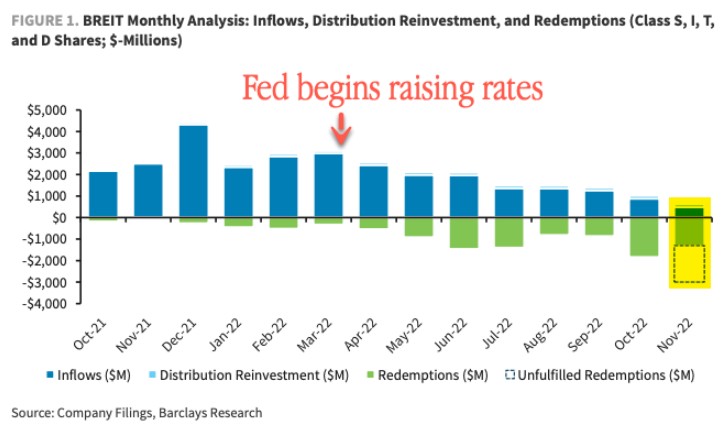 月度数据显示,BREIT 的未兑现赎回额在 11 月激增。