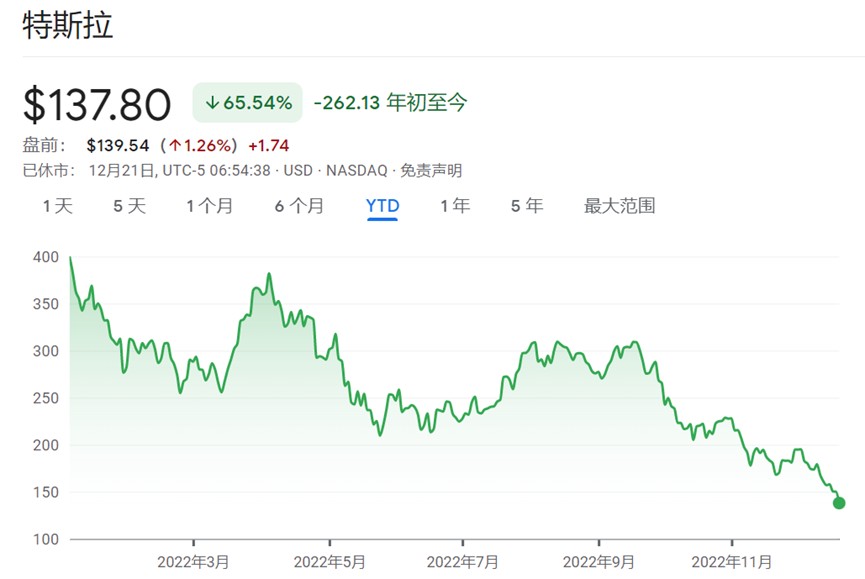 本次裁员消息传出来后,市场还没做出负面反应,特斯拉美股盘前涨超 1%。但值得一提的是,尽管特斯拉的业绩几乎每个季度都创下新纪录,但在通胀飙升以及美联储激进加息的冲击下,公司股价全年一直在下跌,今年迄今的跌幅高达 65%。