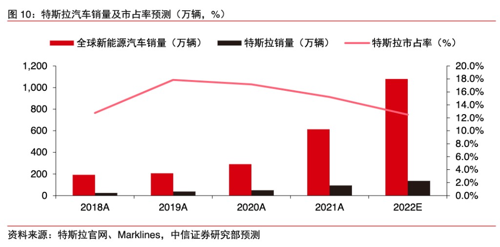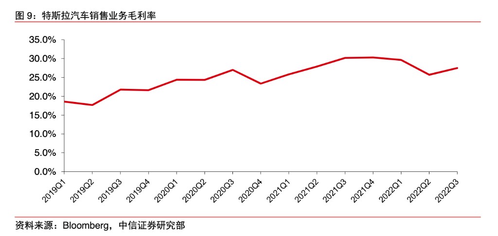 从毛利率来看,中信证券认为,全球需求不确定性上升,特斯拉接近 30% 的整车销售的高毛利率将是其抢夺份额核心支撑,报告指出: