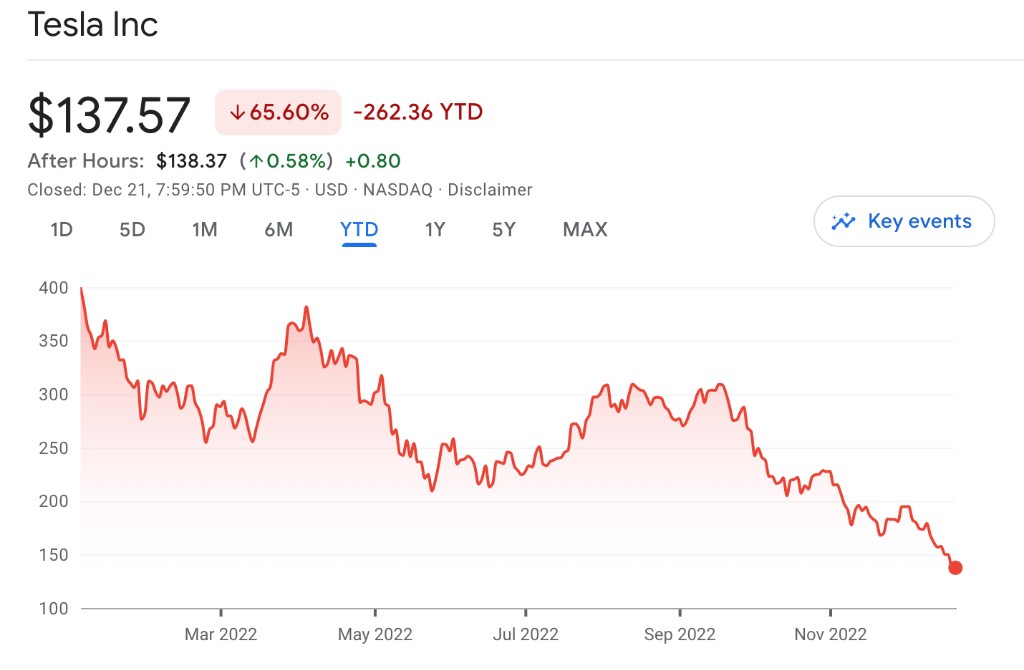 12 月 21 日,特斯拉股价再度重挫,大跌 8%,创下 52 周新低,三个月已累计下跌超 50%,明显落后于美股市场的表现,面对跌跌不休的股价,马斯克认为这都是宏观经济的错。