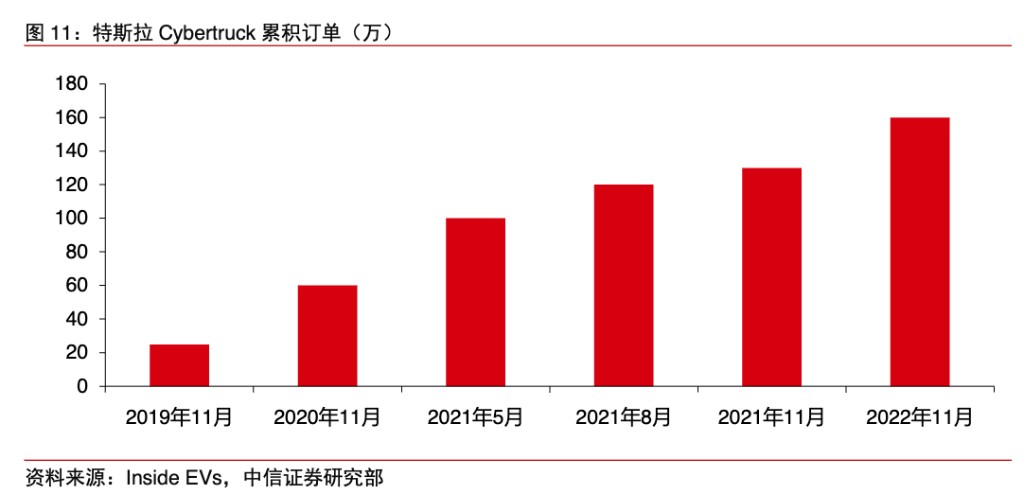 3.新车型上市、成熟车型改款:目前特斯拉半挂型卡车Semi已经开始交付;按照公司公告信息,Cybertruck有望在明年底开始生产,目前累计订单已经超过160万辆;同时,特斯拉针对Model3改款的 “高地计划” 已经进行半年,作为一款上市多年的成熟车型,中期改款亦是重要的积极因素。