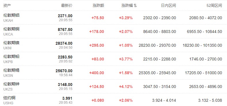 受乐观需求前景提振,基本金属周一普涨,截至发稿,伦锌涨超 4%,伦铅涨近 4%,伦铝涨超 3%,伦铜涨超 2%,伦锡、伦镍涨超 1%。
