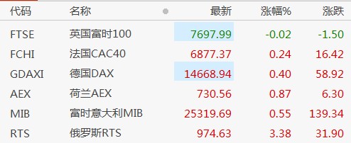 截至发稿,欧洲斯托克 600 指数继上周上涨 4.2% 之后,周一上涨 0.38%。其中,矿业和能源股领涨。英国富时 100 指数微跌 0.02%,法国 CAC40 涨 0.24%,德国 DAX 涨 0.4%,俄罗斯 RTS 指数涨超 3%。